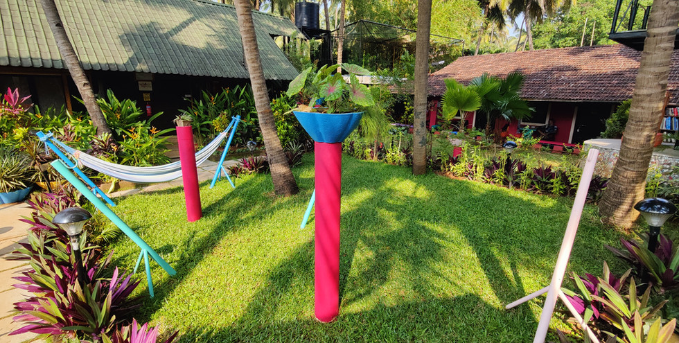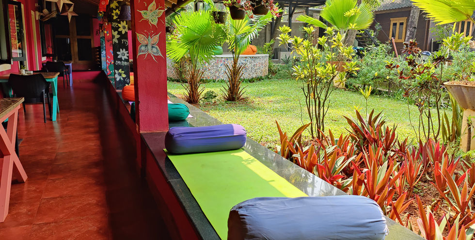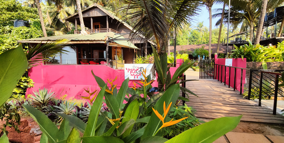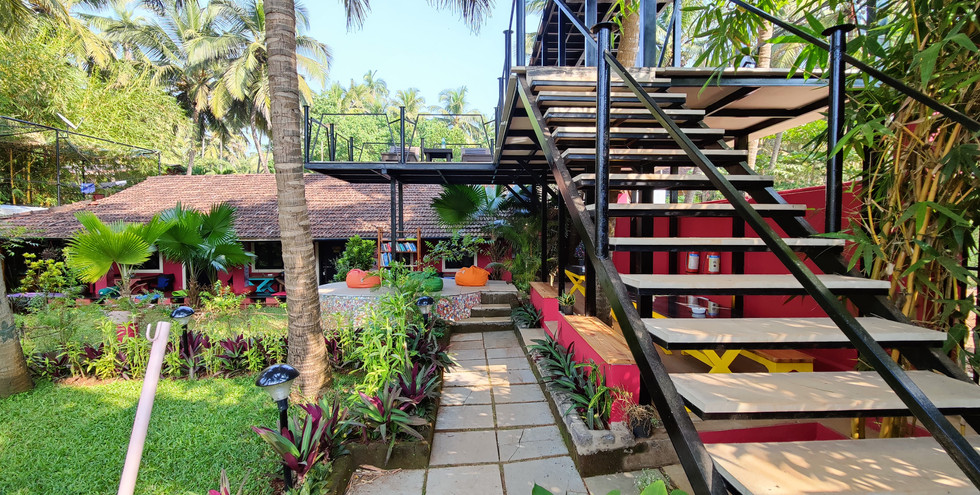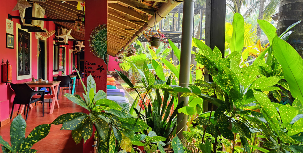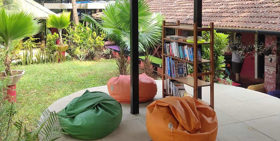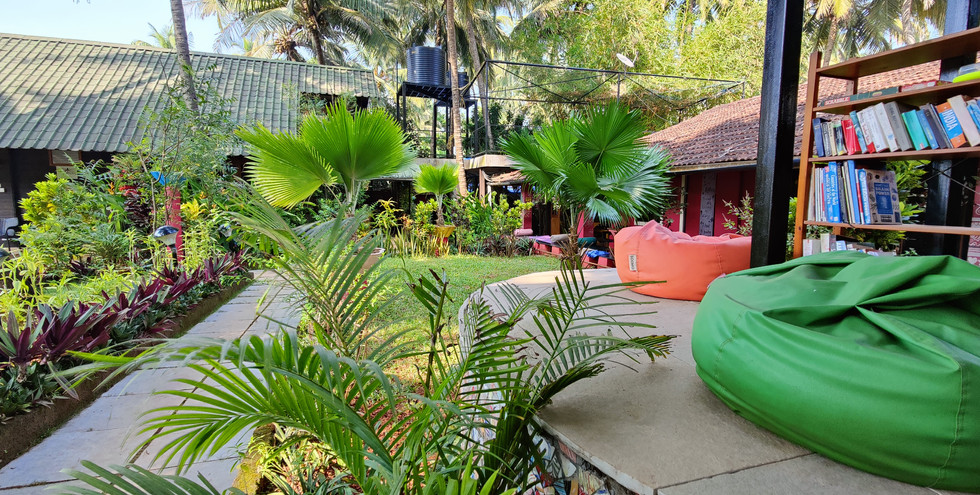 The Yuppi Hippi Hideout is located on the hill overlooking the beach. It is a very old building, a fixture of village life and was used by the hippies when they visited Goa. The facade has been retained as it was then but beautifully made current, so that it is still very much the old cottage except that the rooms and bathrooms are practical. Over all the house is still of earlier times, except very much more comfy than in former times. It is full of small attractive touches - bright striped cushions, with colourful interiors and framed photos of the old hippie days. The large courtyard in front of the cottage has tall coconut palms that sway in the continuous sea breeze blowing straight from the Arabian Sea in front adding to the tranquil village surroundings.